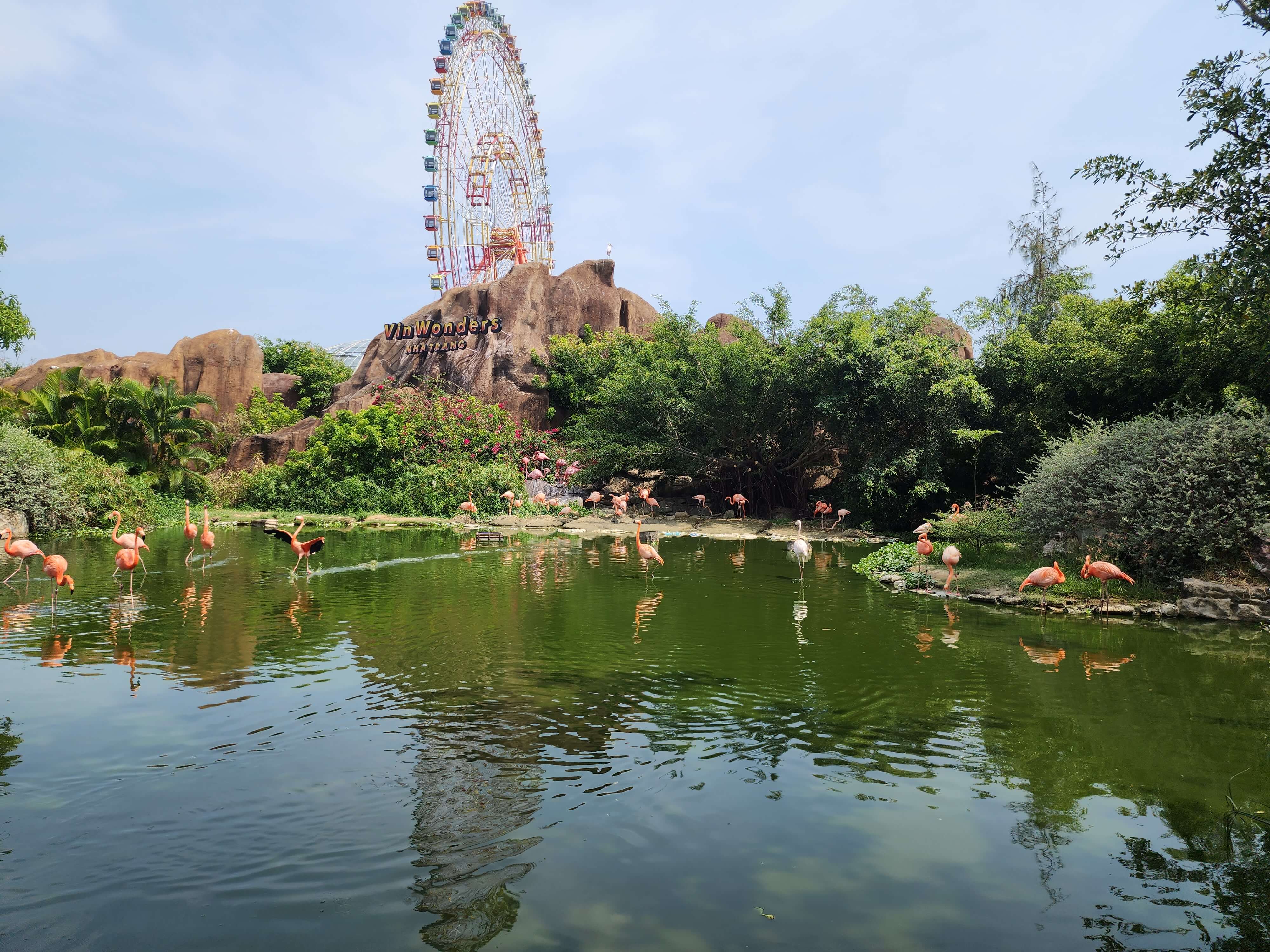 관람차를 배경으로한 플라밍고 호수에 다다르면 저절로 기념사진을 찍게됩니다. 잔잔한 호수에 핑크색 플라밍고가 반기고 기린에게 먹이주기 체험을 선사합니다. 이외에도 다양한 동물들을 만나는 사파리가 기다리고 있습니다.
