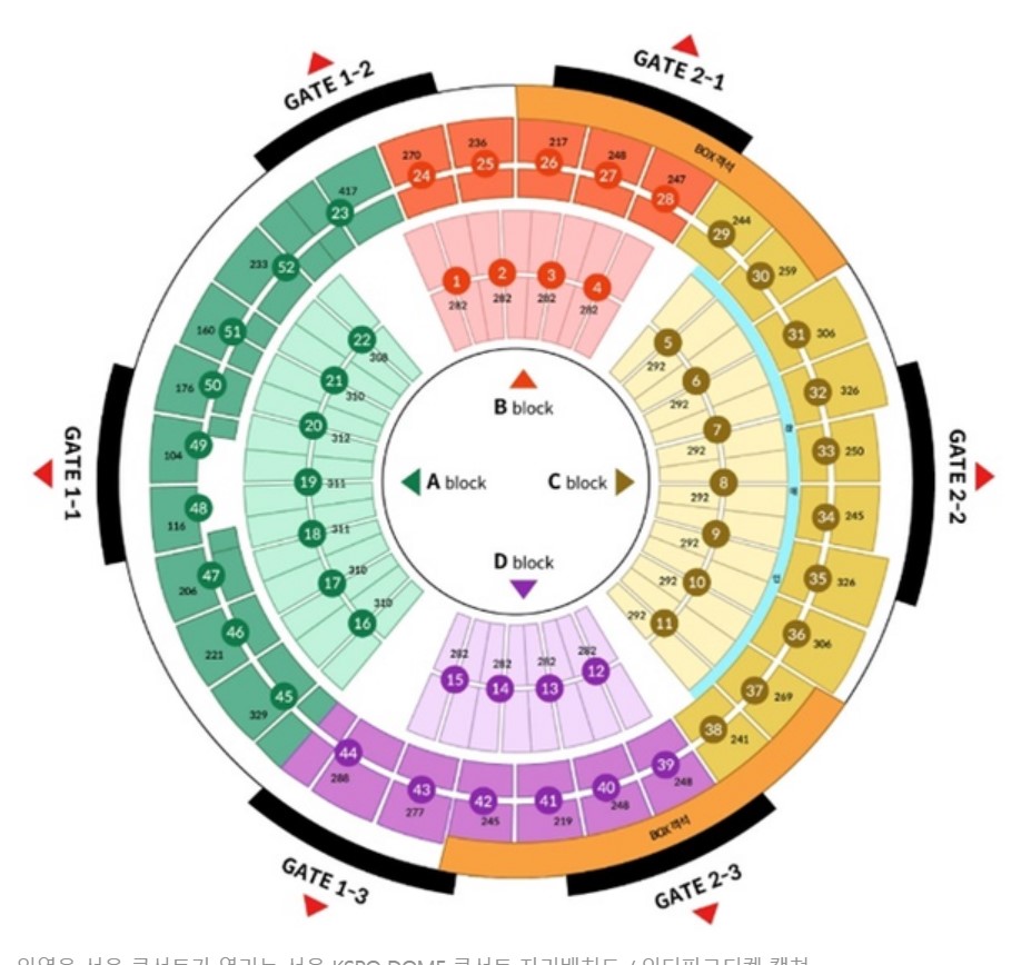 아직 서울공연장의 배치도는 확정되지 않았지만 동일한 장소인 KSPO DOME(올림픽체조경기장)에서 진행된 성시경 콘서트의 아래 배치도 참고하시면 사전에 좋은 자리를 선점하실수 있으실겁니다.